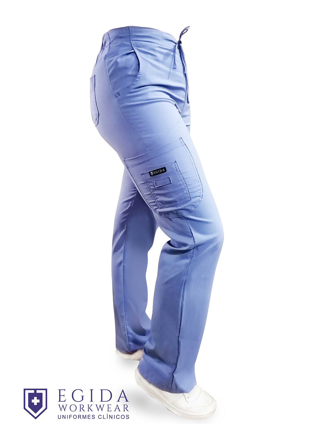 El pantalón clínico diseño cargo color celeste completa el uniforme con un calce moderno, funcional y profesional. Cuenta con cintura elástica ajustable, múltiples bolsillos (delanteros, traseros y lateral de parche) para almacenar tus accesorios esenciales.