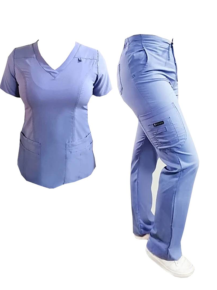 Este conjunto clínico color celeste mujer combina estilo, comodidad y resistencia. Incluye una blusa médica antifluido cuello en forma de corazón, confeccionada con costura de contraste múltiple, bolsillos delanteros multi-seccionales y tela elasticada de alta calidad, ideal para el trabajo clínico.